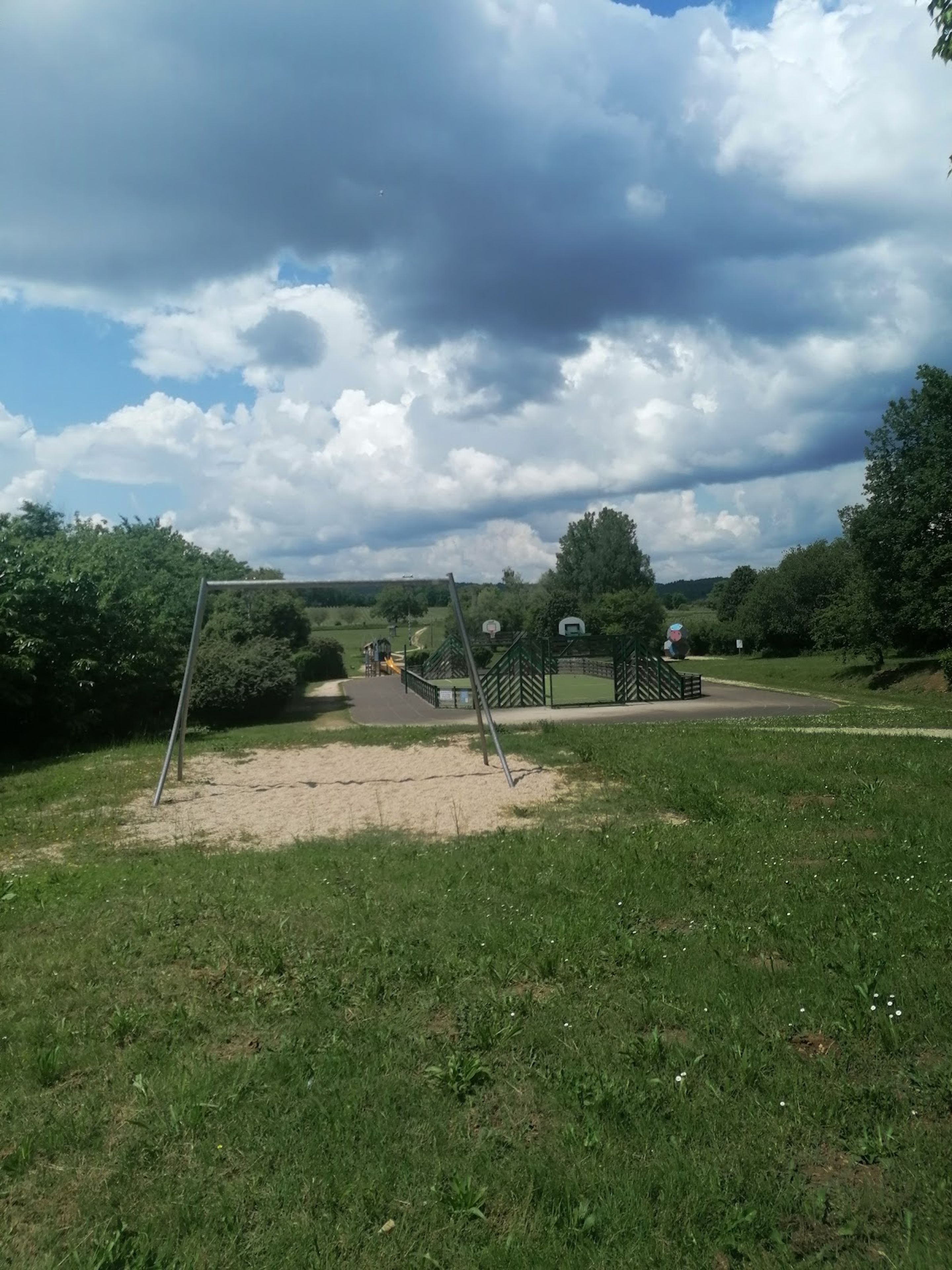 El parque cuenta con equipos de juego modernos que incluyen columpios, toboganes y estructuras para escalar distribuidos en una zona recreativa cerca del centro.