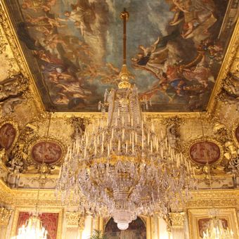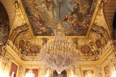 El techo del Gran Salón muestra pinturas alegóricas que representan la Gloria y la Verdad, junto con presentaciones realizadas a la realeza francesa.