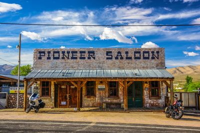El Pioneer Saloon es una cantina del Oeste en Goodsprings, Nevada, con paredes de hojalata repujada original de 1913, una barra de madera y un mostrador de bar Brunswick de principios del siglo XX. El interior conserva los elementos y el carácter de esa época.