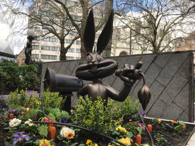 La escultura de Bugs Bunny emerge de un macizo de flores en la sección suroeste de Leicester Square, mostrando al personaje sosteniendo su zanahoria.