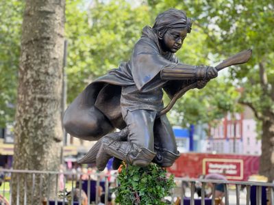 La estatua representa a Harry Potter montando su escoba Nimbus 2000 durante su primer partido de Quidditch de la Piedra Filosofal.
