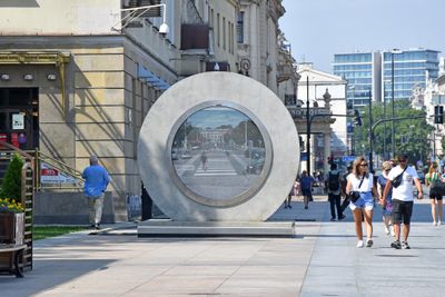 El Portal Lublin-Vilnius es una estructura circular de hormigón en la Plaza Lituana con una pantalla grande para conexiones de video. Transmite en tiempo real lo que sucede al otro lado en Vilnius.