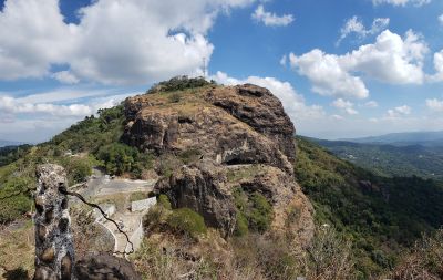 Puerta del Diablo es una formación rocosa en el cerro El Chulo en Panchimalco, El Salvador, donde dos picos de piedra forman un arco natural. El arco se abre hacia vistas de los valles circundantes y las cordilleras, con senderos que serpentean entre árboles y rocas sueltas hacia diferentes miradores.