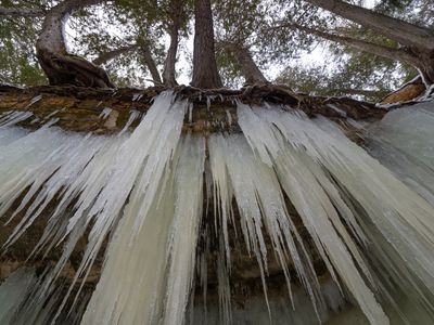 La interacción del agua, la arenisca y los árboles de cedro produce muros de hielo teñidos de amarillo que cambian sus patrones y formas cada temporada. Estas estructuras cambiantes se forman por diferentes flujos de agua y tasas de congelación según las condiciones climáticas invernales.