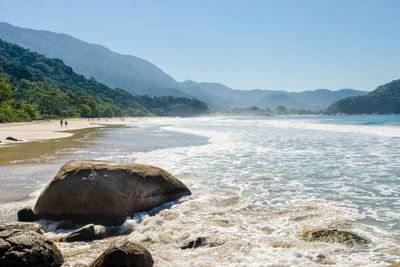 La playa se extiende en una amplia curva de arena blanca bordeada por el denso bosque atlántico y aguas transparentes cerca del pueblo de Trindade.