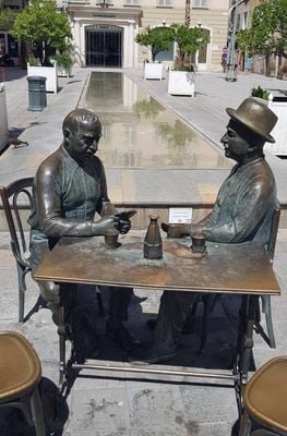 La escultura representa la tradición social de los juegos de cartas en el sur de Francia, inmortalizando personajes del teatro francés.