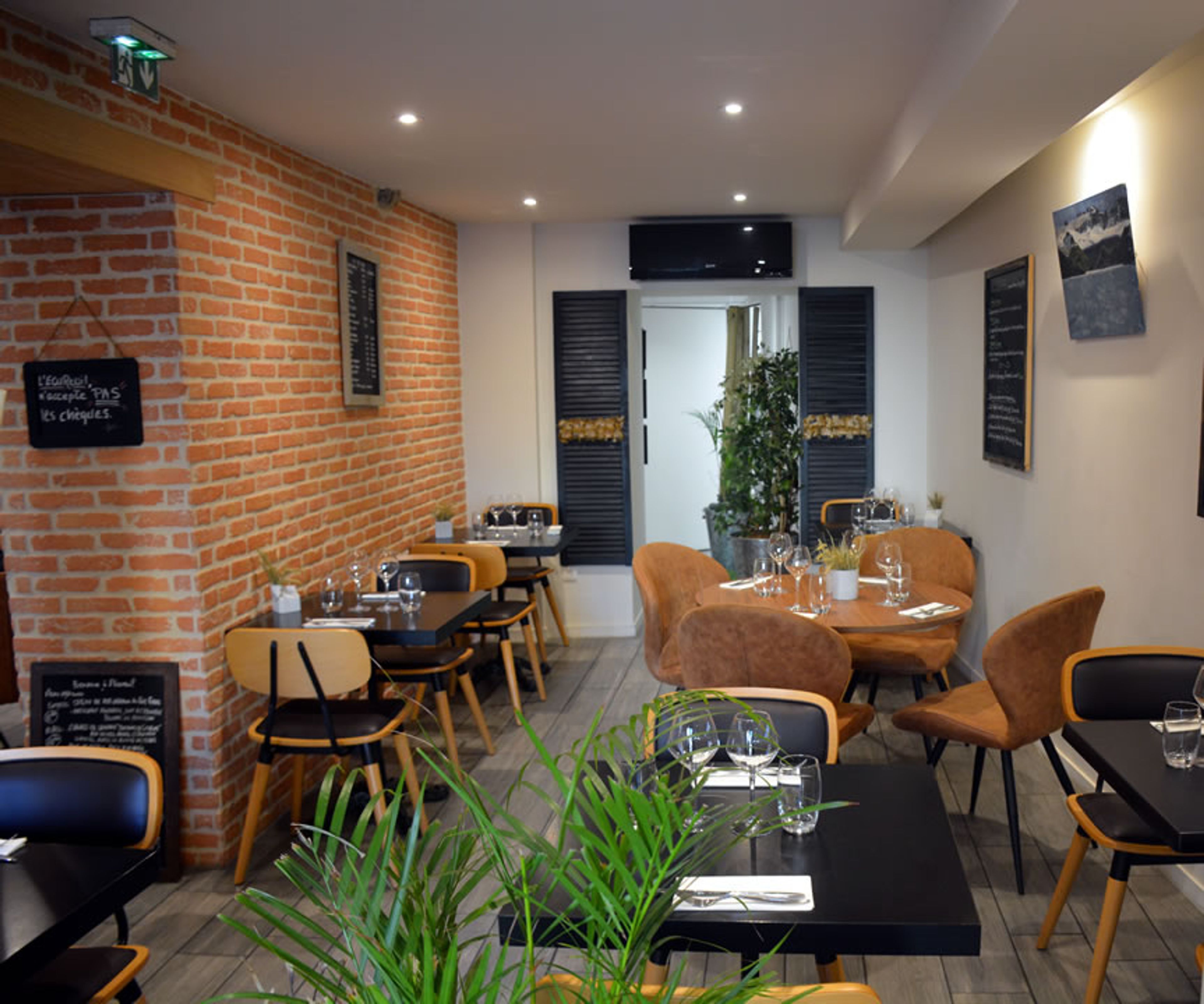 El interior de L'écureuil combina un diseño de bistró moderno con elementos campestres, presentando un menú en pizarra que muestra productos frescos del mercado.