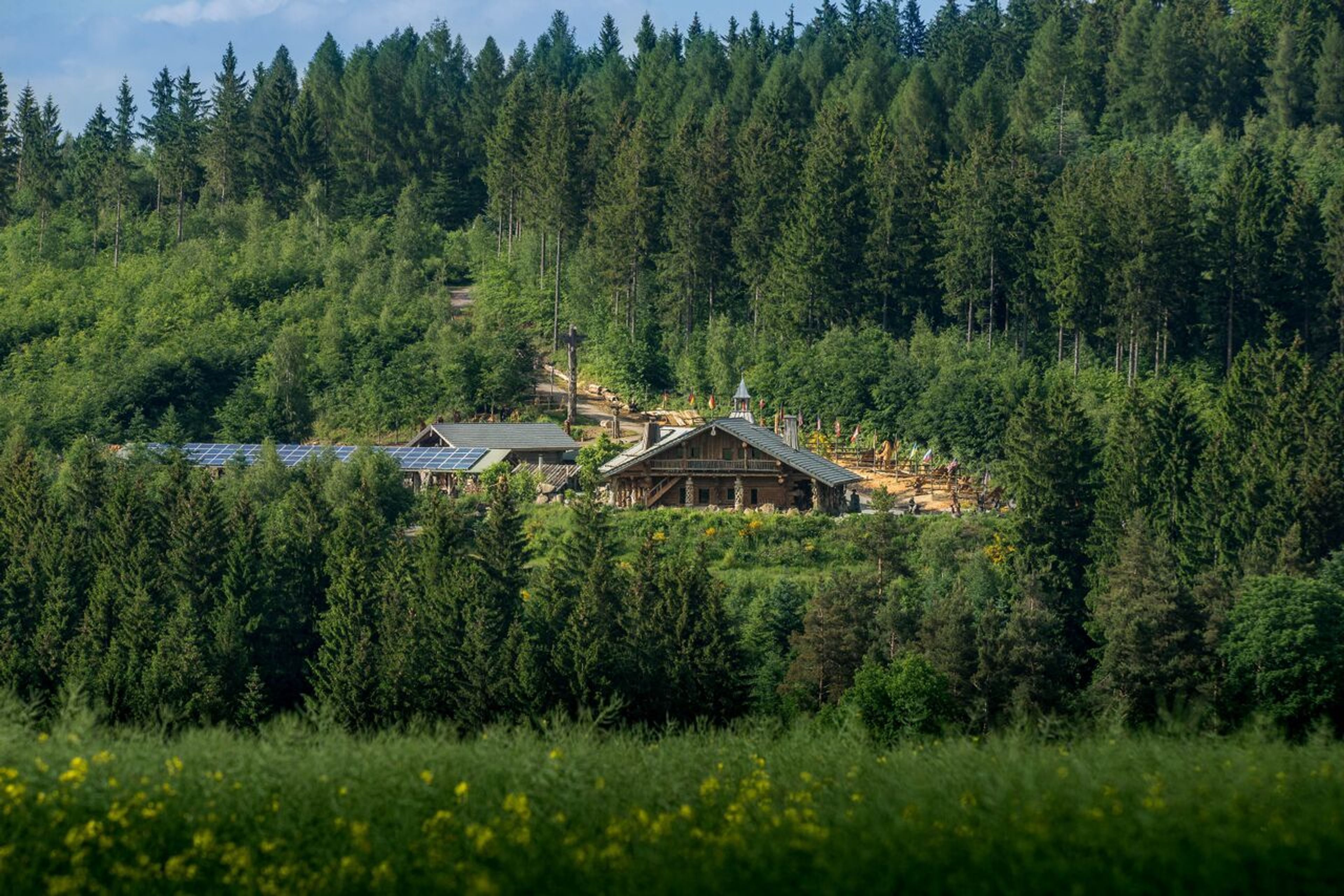 Cuatro casas de troncos naturales se encuentran entre cientos de figuras talladas con motosierra en un bosque mixto de hayas, arces y abetos.