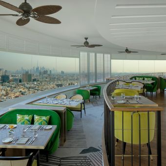 Al Dawaar es un restaurante en el piso 25 del Hyatt Regency Dubai que gira lentamente mientras los clientes comen. El espacio sirve comida internacional y ofrece vistas de la ciudad que cambian durante la comida.