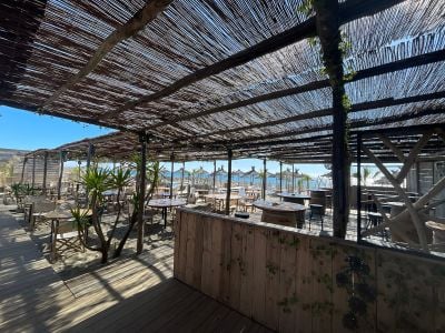 L'effet Mer integra la gastronomía mediterránea con una ubicación frente al mar, ofreciendo espacios interiores ventilados y mesas exteriores sobre la arena.