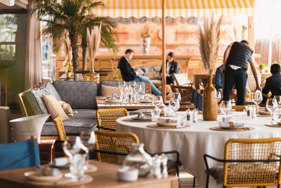 La Plage du Festival integra una playa privada con gastronomía mediterránea, ofreciendo mesas directamente sobre la arena y tumbonas cerca del mar.