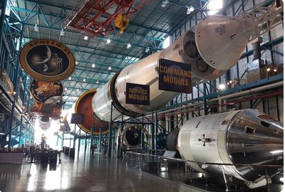 El Kennedy Space Center exhibe salas con vehículos espaciales, módulos lunares, equipamiento de astronautas y naves auténticas de misiones NASA.