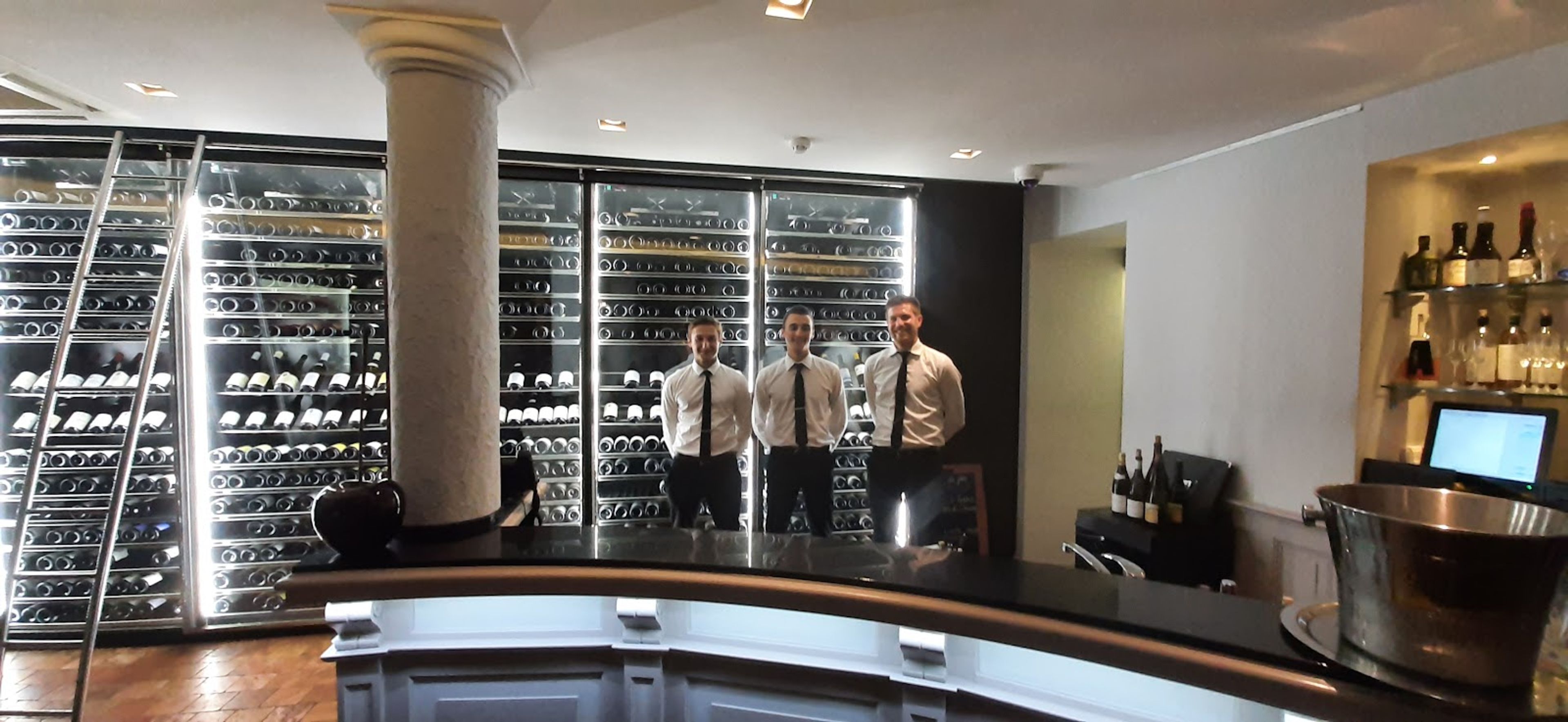 Una colección de 500 vinos envejece a temperaturas específicas en una bodega exhibida detrás del bar, permitiendo a los comensales observar el proceso de conservación.