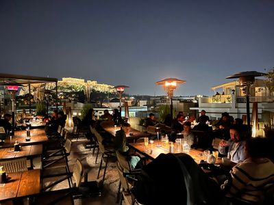 El restaurante combina servicios de restauración con un Salón Shisha dedicado, ofreciendo experiencias culinarias y productos de tabaco frente al horizonte de Atenas.