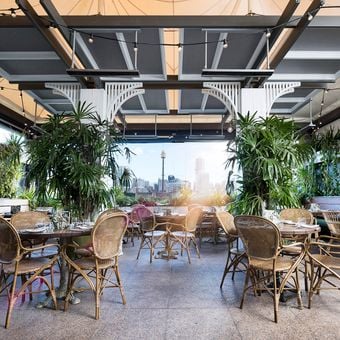 Los comensales disfrutan de vistas panorámicas del horizonte de Sídney desde la terraza soleada, que presenta muros de piedra arenisca original y abundante follaje natural.