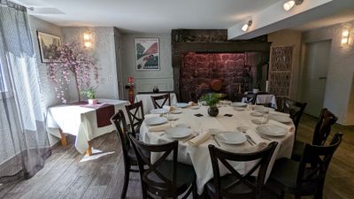 El edificio del restaurante La Baraque conserva elementos arquitectónicos originales de 1800, como arañas, molduras y una chimenea tradicional.