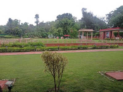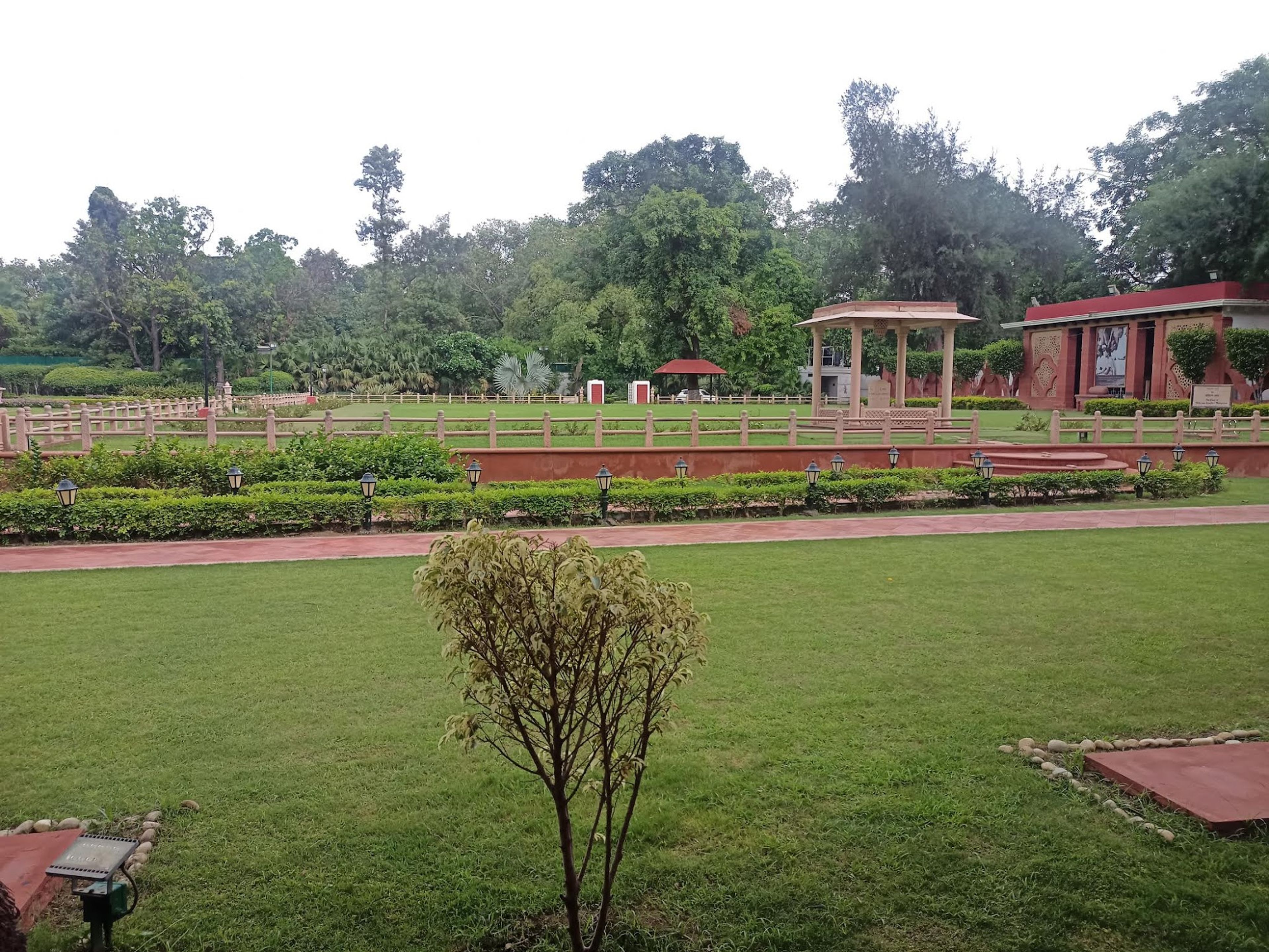 Una Columna de los Mártires marca el lugar exacto donde Gandhi fue asesinado, mientras que un pilar distintivo muestra los símbolos Swastika y Om representando el patrimonio cultural indio.