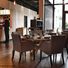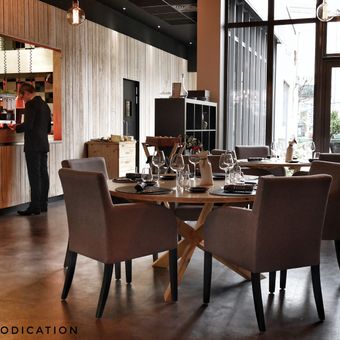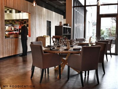 El restaurante presenta un interior moderno con suelos de piedra gris, tablones de madera natural y una cocina abierta visible.