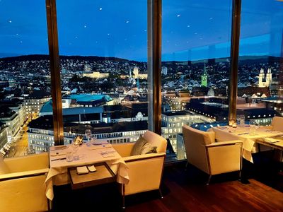 El restaurante opera dentro de uno de los edificios de gran altura prominentes de Zúrich, representando el desarrollo arquitectónico moderno que comenzó a transformar el paisaje urbano a finales del siglo XX.