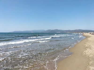 La playa se extiende durante 7 kilómetros a lo largo de la costa del Mar Egeo, con aguas poco profundas y arena suave del delta del río Meandro.
