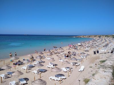 La playa de Ayazma se extiende a lo largo de 500 metros de costa con arena dorada fina y aguas turquesas cristalinas frente a acantilados de piedra caliza.