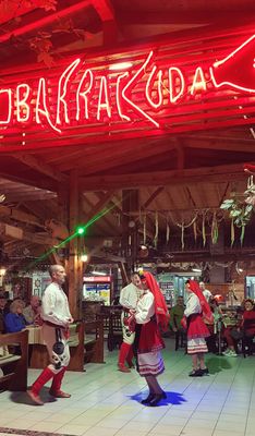 El restaurante presenta programas nocturnos de entretenimiento con actuaciones en vivo de música folclórica tradicional balcánica y rusa.