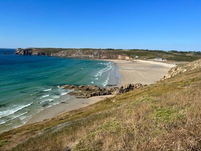 La playa de arena se extiende entre Pointe du Raz y Pointe du Van, formando una bahía natural en la costa occidental de Finistère en Bretaña.
