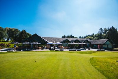 El campo de 18 hoyos se extiende por colinas con obstáculos de agua y búnkeres de arena a lo largo de sus 470 yardas.