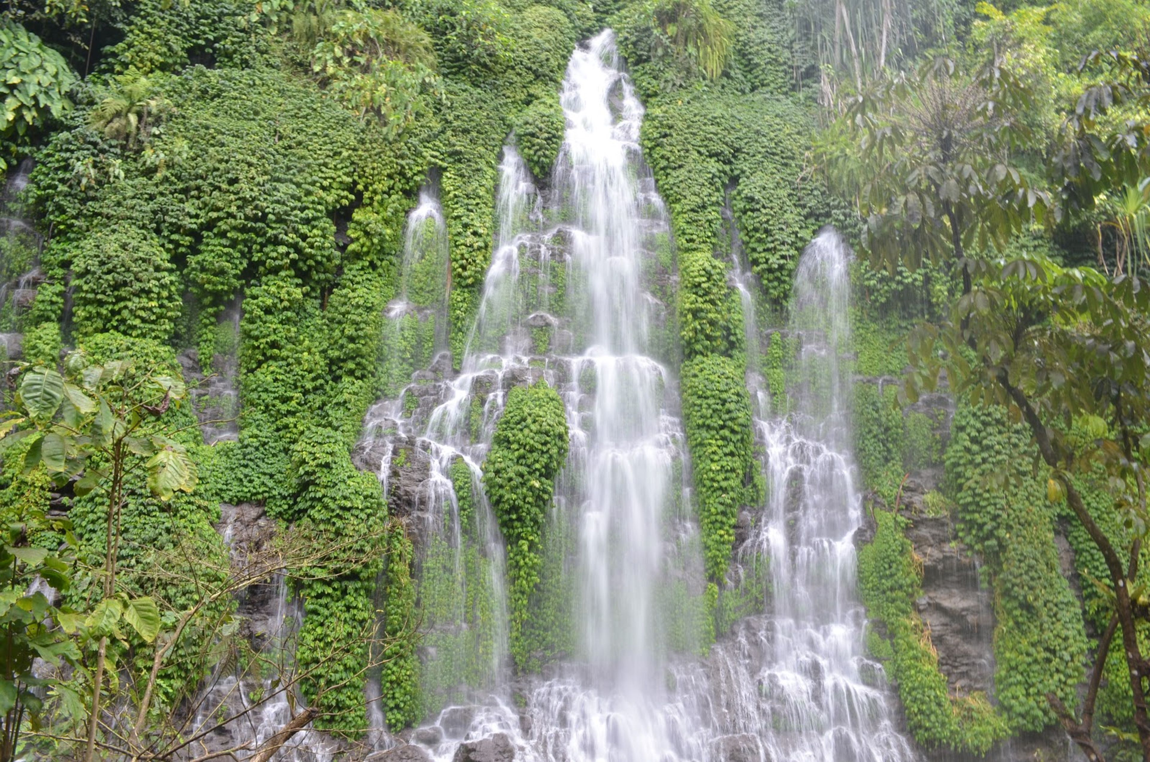 La cascada crea un efecto de cortina verde natural cuando el agua fluye entre espesas enredaderas, con dos cascadas menores visibles desde el lado derecho.