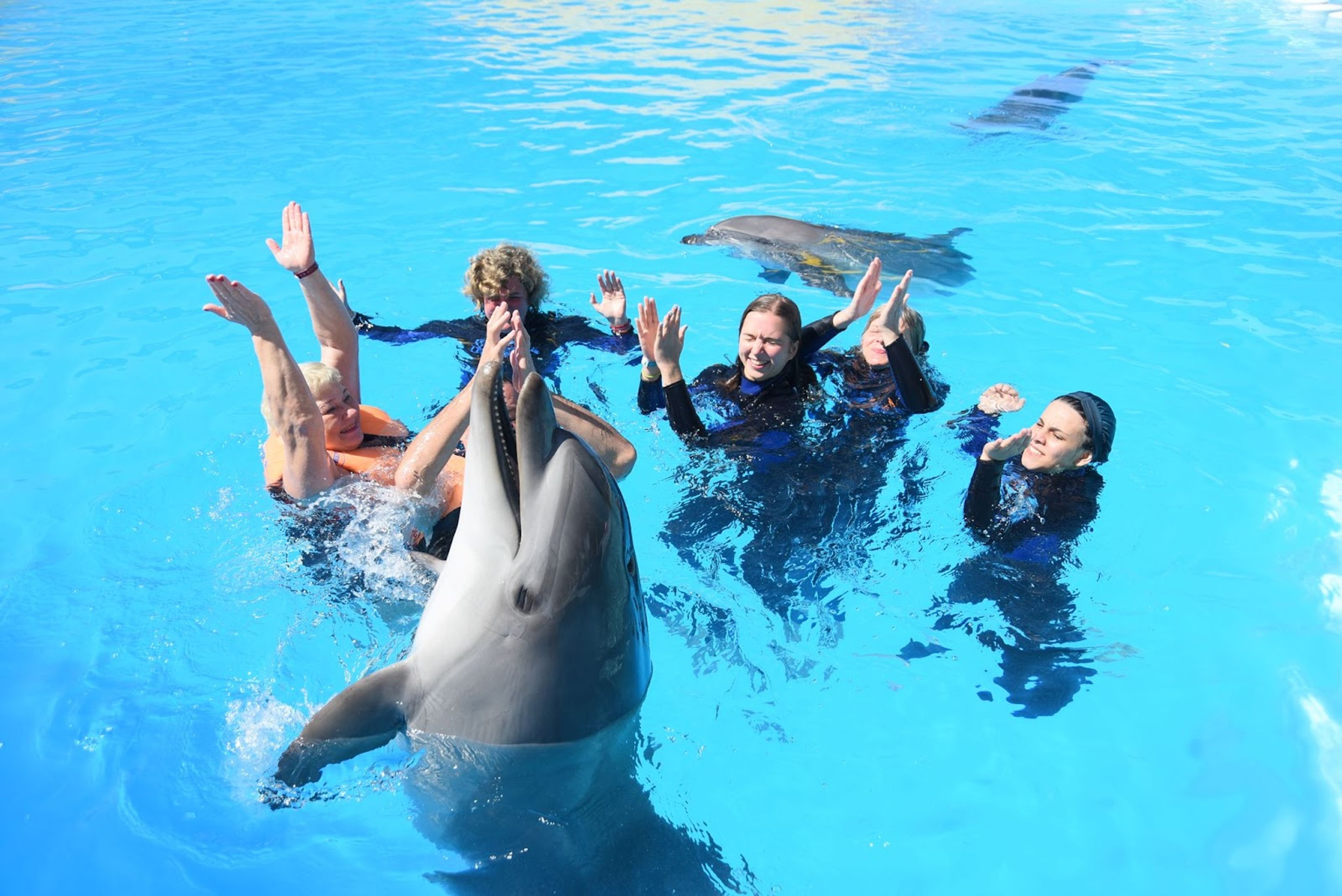 Dolphina cuenta con piscinas interiores y exteriores donde los visitantes observan a los delfines realizar comportamientos y participan en programas de natación.