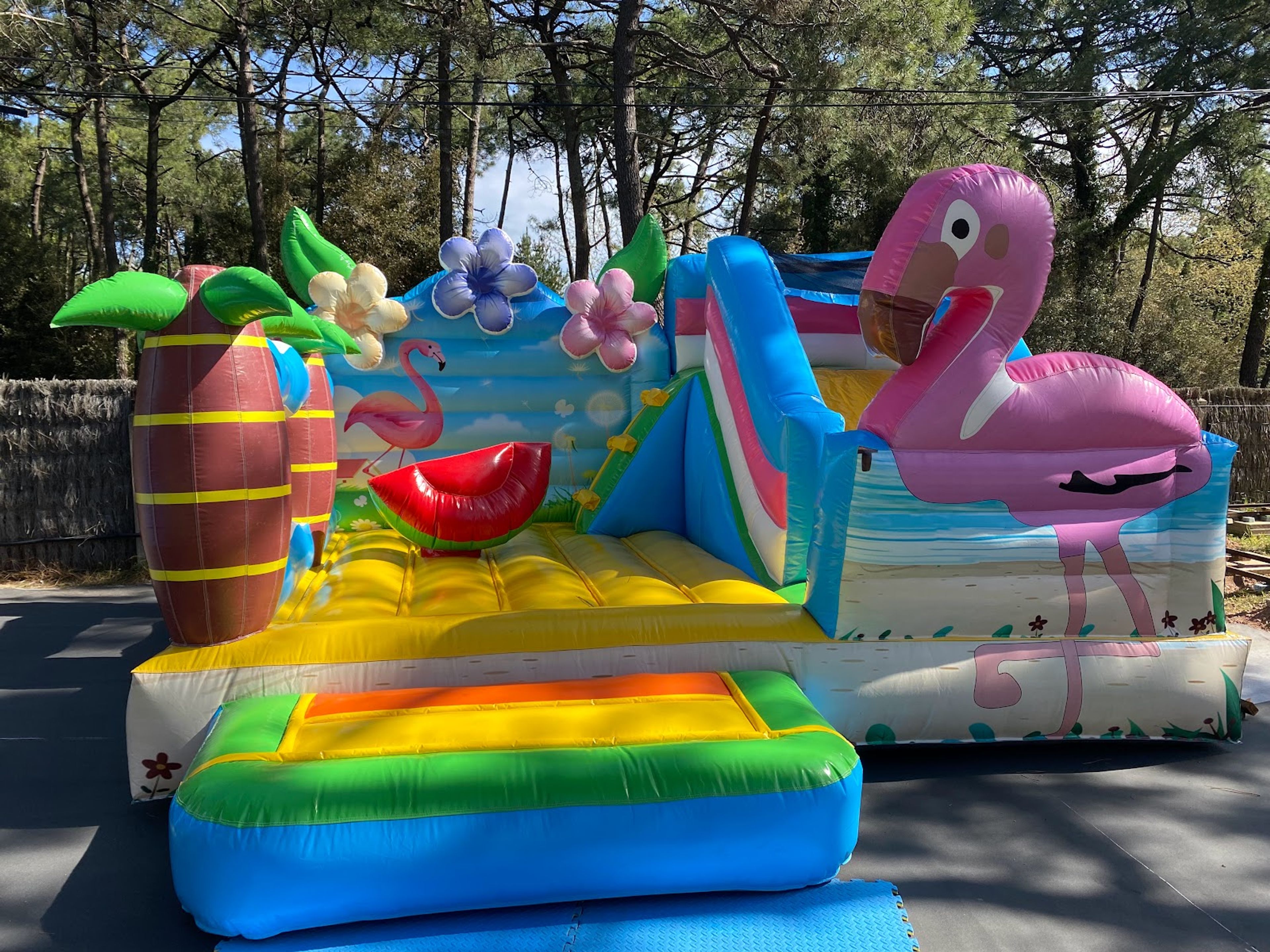 El parque ocupa 8.000 metros cuadrados bajo pinos y cuenta con 15 atracciones que incluyen estructuras inflables, pistas de minigolf y zona infantil.