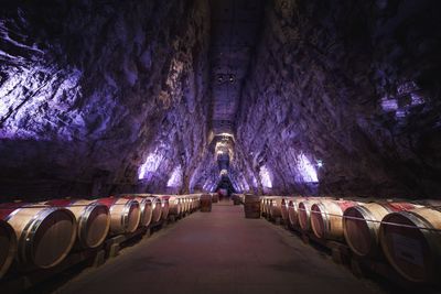 Los comensales pueden explorar galerías subterráneas con exposiciones de vinos antes o después de su comida, viajando en un pequeño tren.