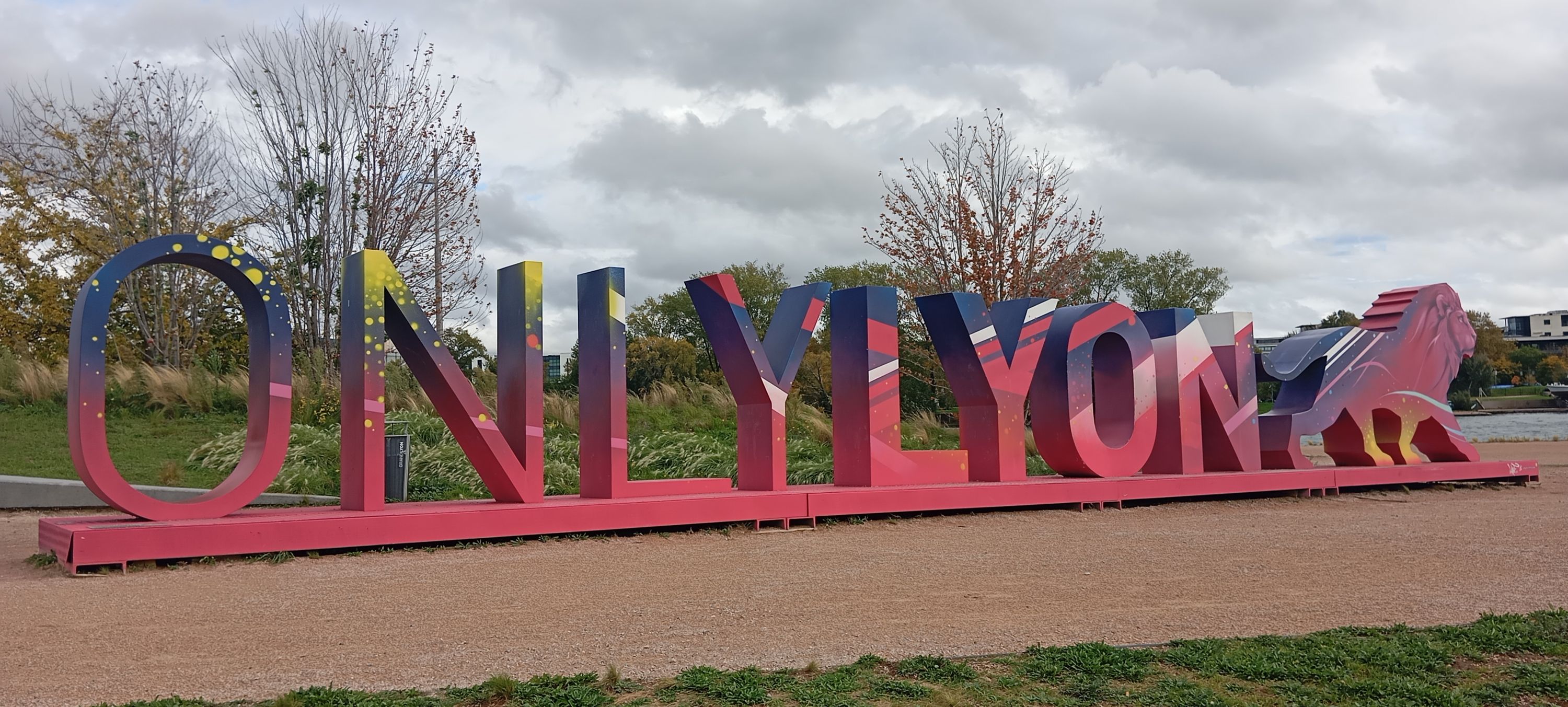 Esta escultura contemporánea presenta grandes letras rojas y blancas que se alzan prominentemente en la explanada del Museo de las Confluencias desde 2015.