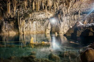 El cenote contiene múltiples columnatas formadas por estalagmitas y estalactitas conectadas, creando piscinas naturales tipo jacuzzi dentro del sistema de cuevas.