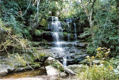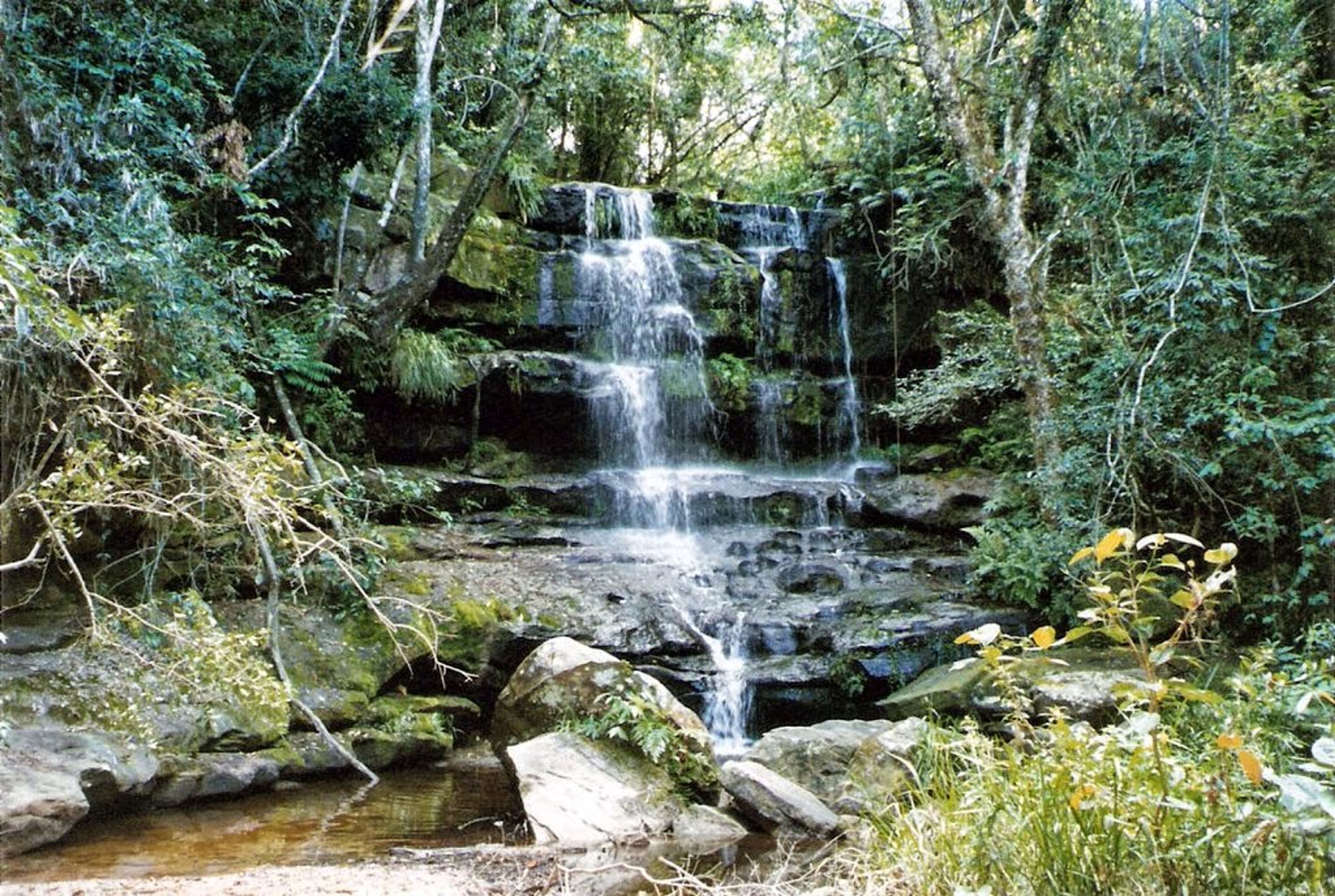 Una cascada en la provincia de Paraguarí se precipita sobre múltiples niveles de formaciones rocosas de basalto negro, rodeada de vegetación subtropical. El agua desciende a través de varios niveles, formando sucesivas piscinas naturales entre los salientes rocosos. La densa cobertura arbórea enmarca la cascada, mientras helechos y musgos crecen sobre las superficies rocosas húmedas. El volumen de agua varía según la estación y afecta el caudal a través de las formaciones.