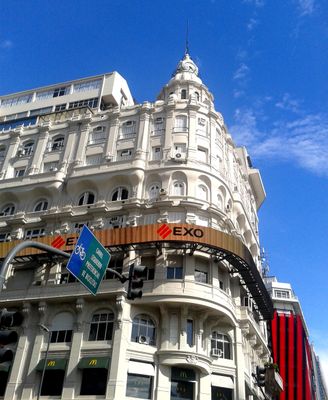 El edificio Trust Joyero Relojero se eleva once pisos en la intersección de la Avenida Corrientes y la Avenida 9 de Julio.