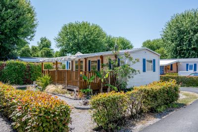 El camping se extiende por una amplia zona cerca del lago Biscarrosse, con casas móviles, chalés y espaciosas parcelas para tiendas y caravanas.