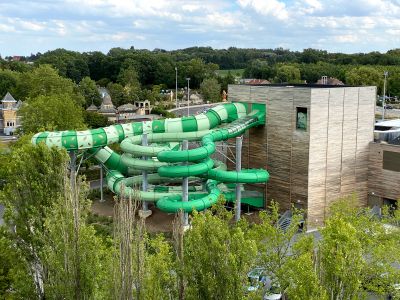 El complejo acuático incluye múltiples áreas de natación, con toboganes de velocidad, piscinas de olas y zonas designadas para nadadores pequeños.