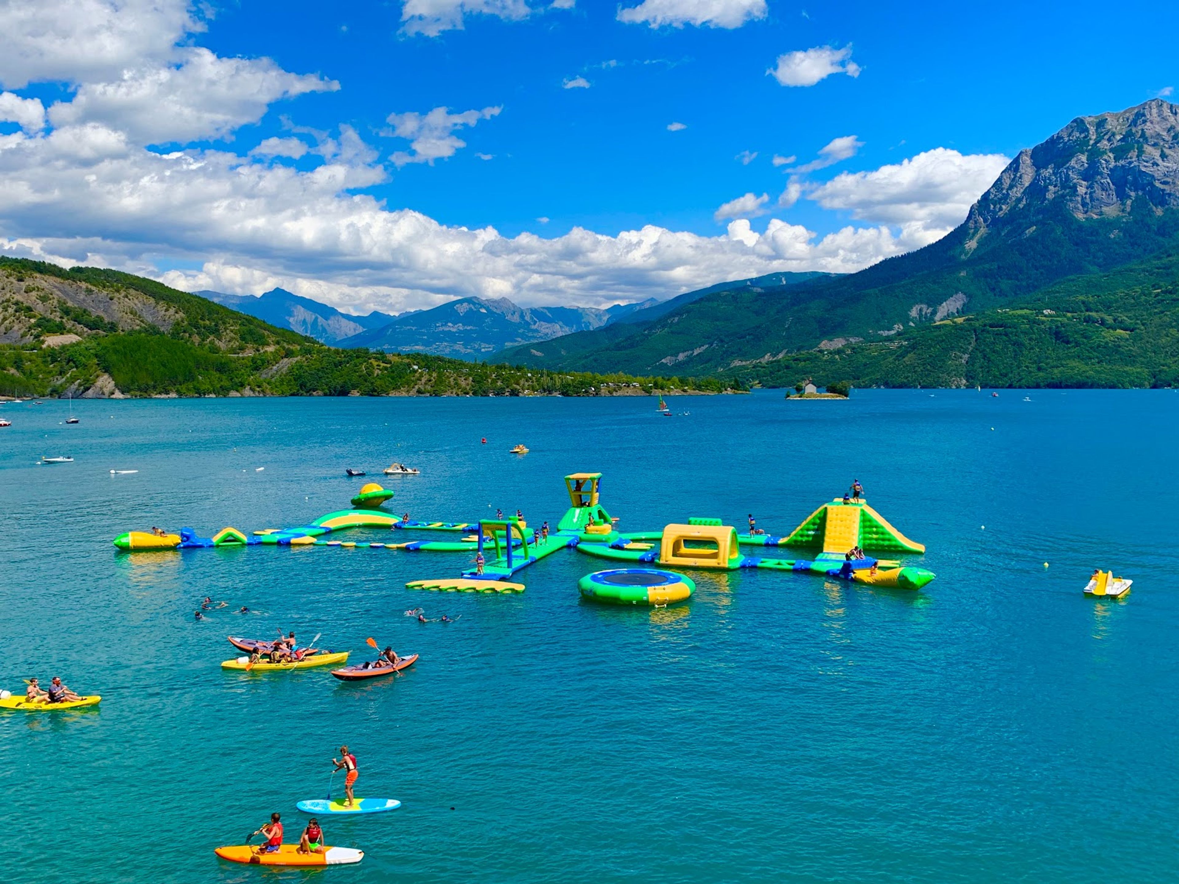 Aquaparc cuenta con numerosos toboganes inflables, senderos y trampolines distribuidos por el lago Serre-Ponçon, ofreciendo entretenimiento acuático durante la temporada estival.