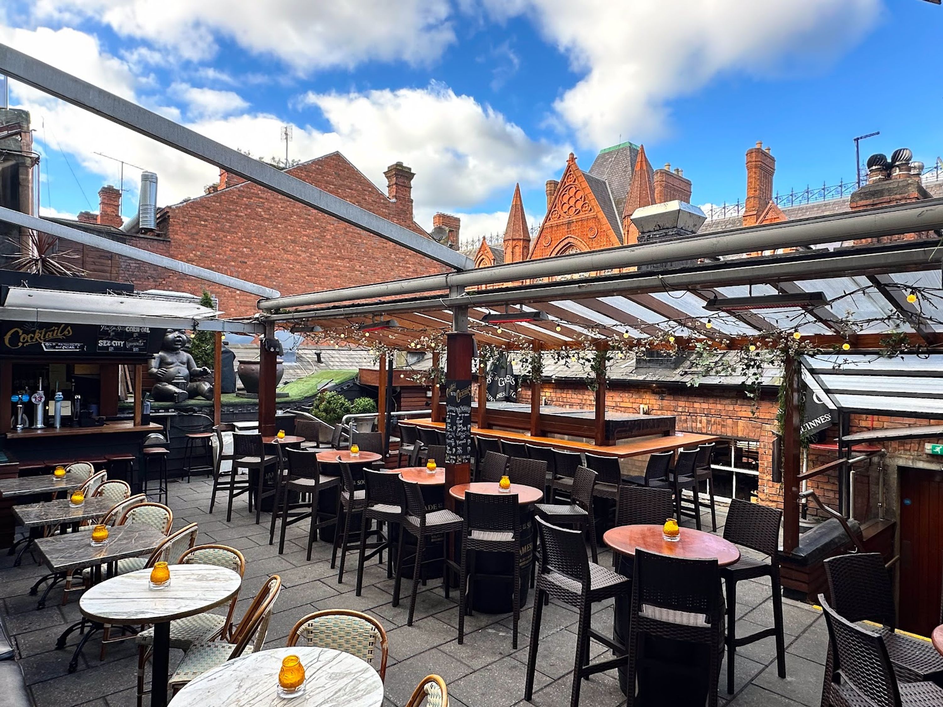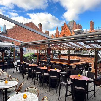 La terraza Winter Garden en la azotea proporciona un espacio social al aire libre donde los clientes pueden disfrutar de cócteles exclusivos y panes planos mientras contemplan vistas panorámicas del centro de Dublín hasta altas horas.