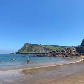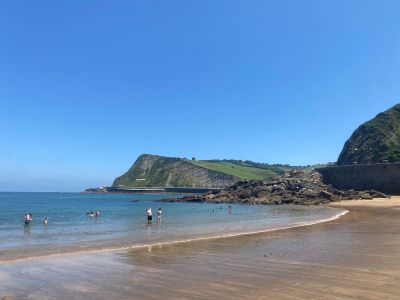 La playa Santiago se extiende a lo largo de 350 metros con 175 metros de ancho, presentando arena dorada fina junto al mar Cantábrico.