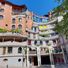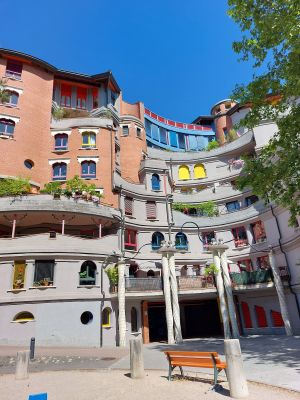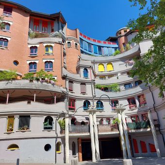 La zona presenta edificios curvos y coloridos conocidos como 'Casas Pitufos', que recuerdan los estilos arquitectónicos de Gaudí y Hundertwasser.