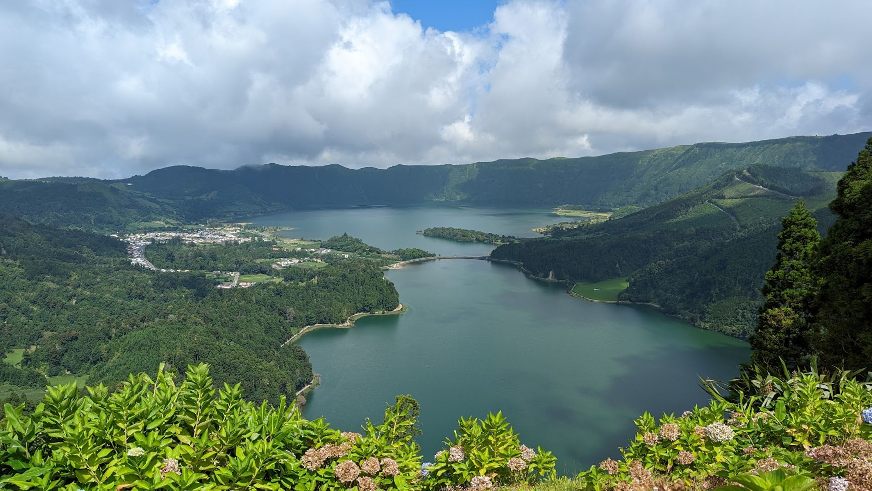 El mirador Vista do Rei se asoma sobre dos lagos en un cráter volcánico, uno con aguas verdes y otro con aguas azules.