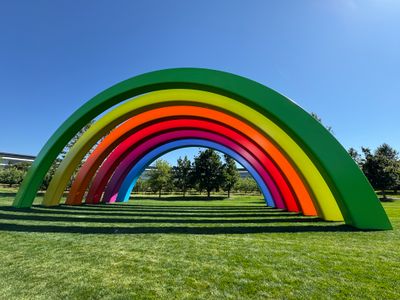 El Escenario Arcoíris de Apple presenta seis arcos coloridos fabricados con 25,000 piezas individuales de aluminio en configuración semicircular.