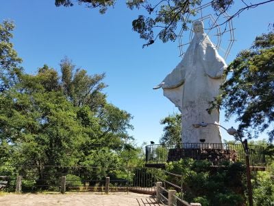 Una escultura blanca de Nuestra Señora de Aparecida, creada en 1994 por los artistas Roberto y Patricia Ayala, marca la cumbre y sirve como punto de referencia religioso para la comunidad de San Bernardino y sus visitantes durante todo el año.