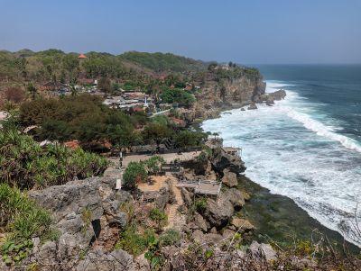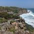 La playa presenta arena volcánica negra, arrecifes de coral y acantilados escarpados que dominan el mar en la costa sur de la isla de Java.