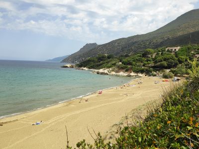 La playa se extiende 200 metros por la costa corsa, con arena beige clara y formaciones de granito en ambos extremos.