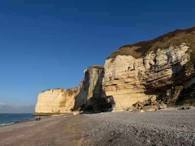 La playa se encuentra entre acantilados de piedra caliza similares a Etretat, sin instalaciones comerciales, conservando su estado natural.