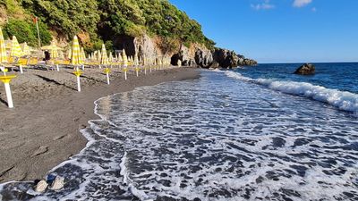 La playa de arena oscura y guijarros se extiende junto al mar Tirreno, rodeada por densos bosques de pinos y acantilados de Marina di Maratea.