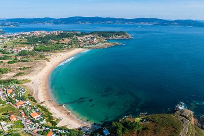 La playa de Montalvo se extiende por la costa gallega con arena fina y aguas tranquilas, rodeada de vegetación natural y acantilados suaves que crean un entorno costero protegido.